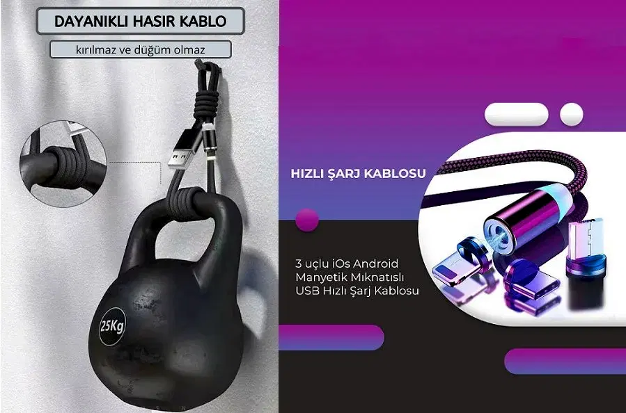 3 uçlu iOs Android Manyetik Mıknatıslı USB Hızlı Şarj Kablosu